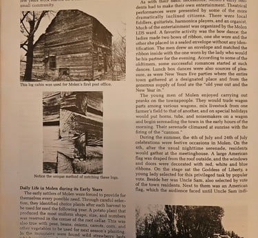 Work in Molen wasn’t confined to the fields and barns. The settlers built essential infrastructure that helped the community flourish. Small barns, workshops, blacksmith shops, and stores sprang up as people found ways to meet their needs and sustain their livelihoods. These spaces became the centers of daily life where goods were traded, horses were shoeed, and tools were repaired. The town also established a schoolhouse, where children learned to read and write, and a church where the settlers gathered to worship and seek spiritual guidance. Religion played a central role in Molen, with Mormon faith and practices deeply woven into the daily lives of its settlers. They gathered for weekly services, as well as for special events, such as baptisms, weddings, and community prayers, which helped strengthen bonds and create a sense of shared purpose.